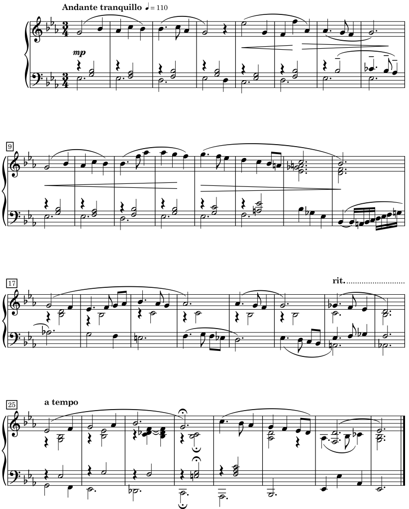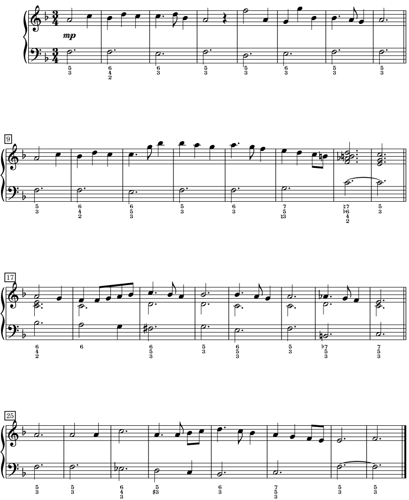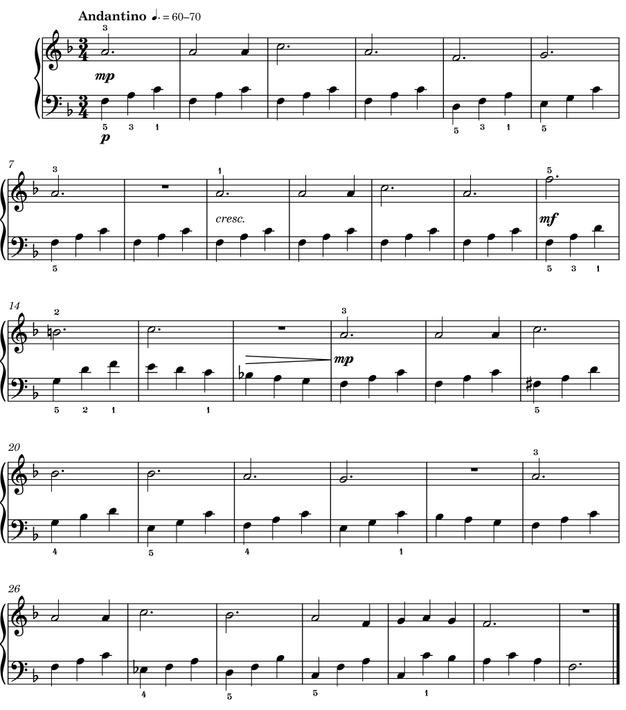 This piece consists of four 8-bar phrases. The left hand moves in constant quarter notes until the very last measure while the right-hand melody moves primarily in dotted half notes with the occasional trochaic rhythm. The melody’s apex occurs in measure 13, which, when combined with the bass, gives the piece a maximum range of two octaves plus a fourth. The harmony is mostly diatonic, with short tonicizations to the dominant, supertonic, and subdominant.